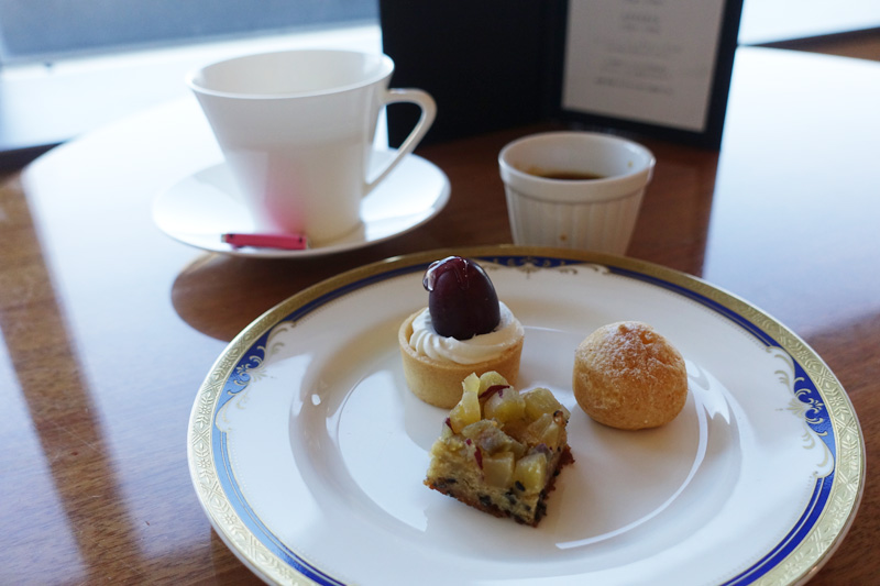 キャラメルナッツケーキ、スイートポテト、ぶどうのタルト、スコーン(クロテッドクリーム)