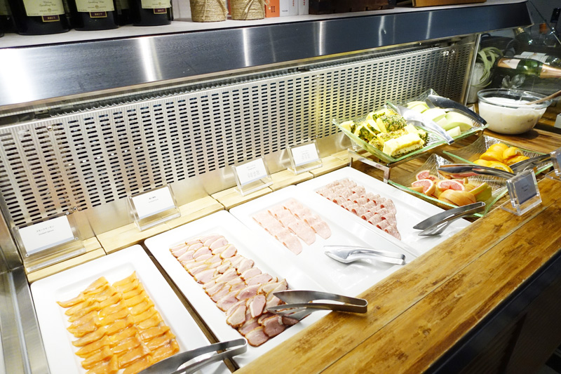 スモークサーモン、鴨の燻製、ハム2種、グレープフルーツ、オレンジ、パイナップル、メロン、ヨーグルト