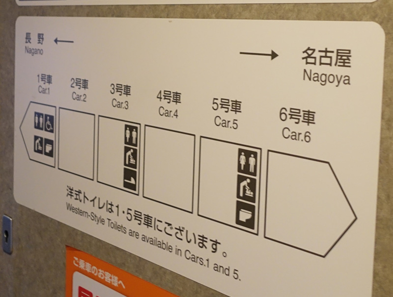 私も今回、名古屋から長野方面へ特急しなのに乗る機会があり、車内でトイレの位置を確認してみました。